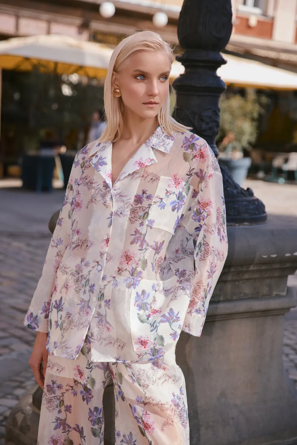 Костюм з органзи в піжамному стилі сорочка +брюки. Сорочка з відкладним коміром на гудзиках. Накладні кишені.Рукава широкі, прямі.Брюки широкі, прямі, з кишенями. Пояс на широкій ґумці.Принт:”Дорогою до Портофіно” вінтаж на молочному.Можливе пошиття: