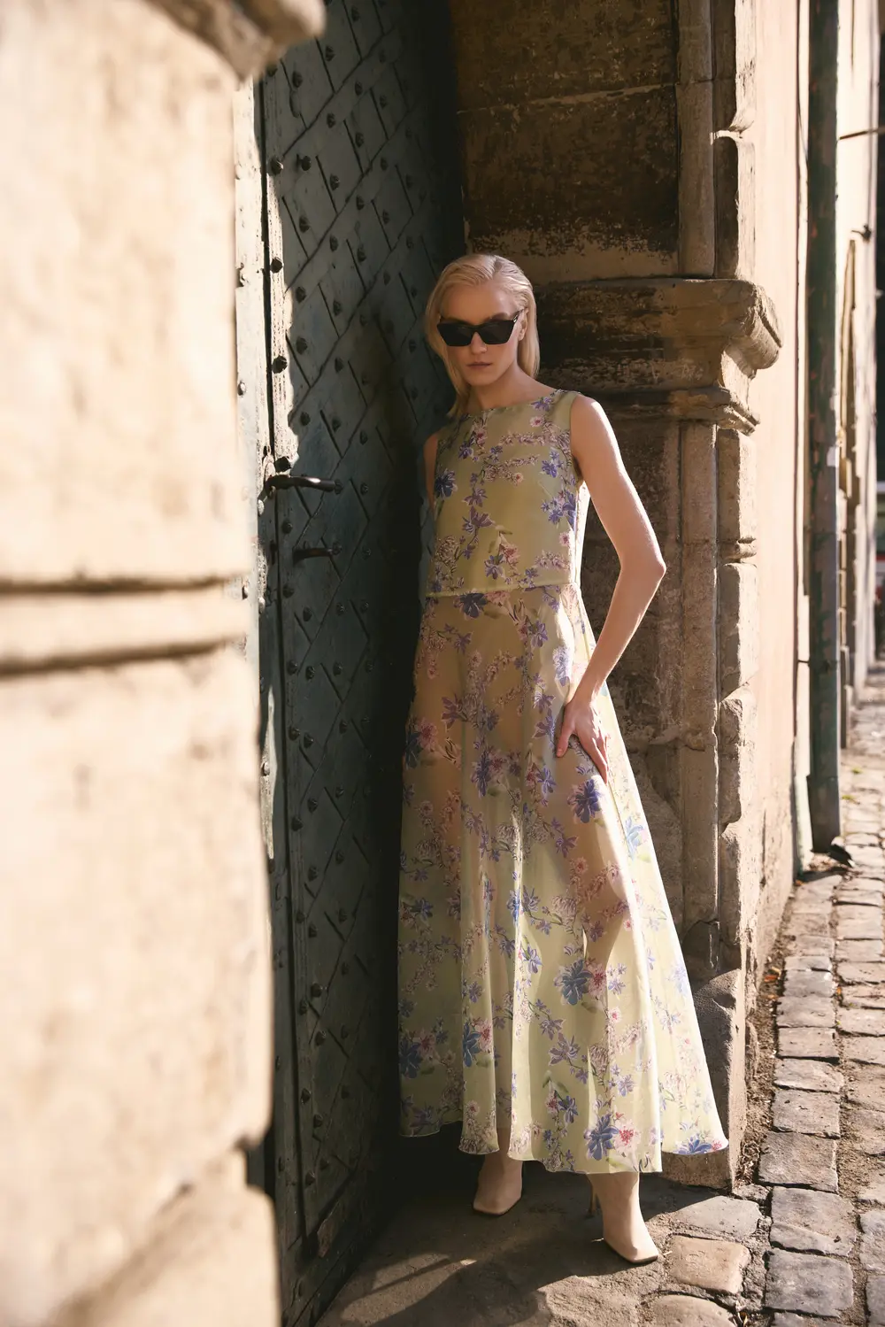 Легка повітряна сукня з оргазни . З круглою горловиною. Відрізна по талії, з кишенями. Із застібкою замком по спині .Оливкового відтінку. Принт:”Дорогою до Портофіно” вінтаж на оливковому. Можливе пошиття: